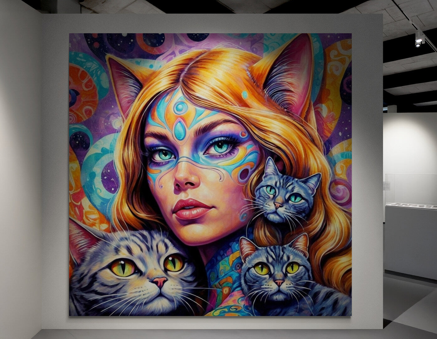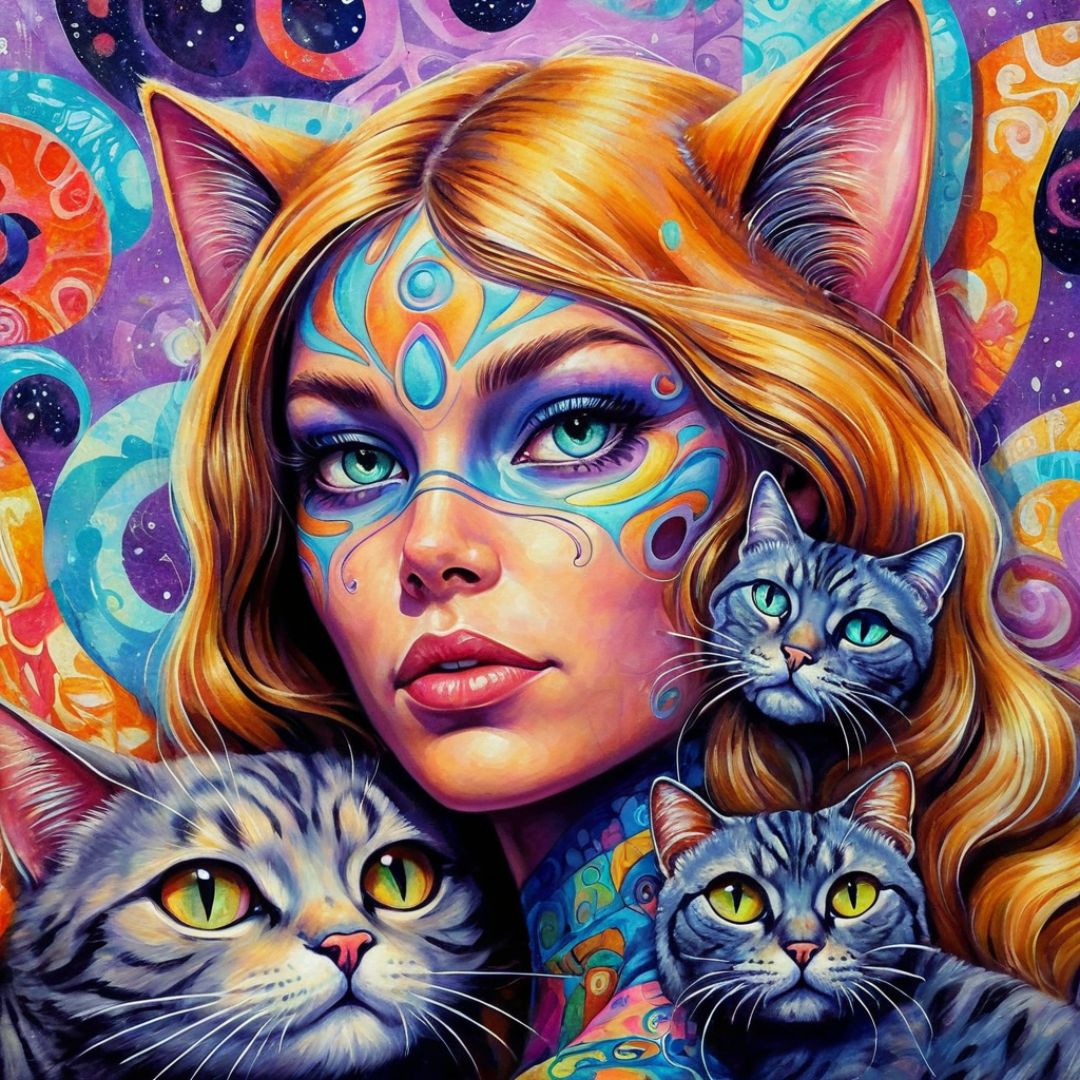 She doesn’t whisper — she laughs. Loud. Bright. Unapologetic. Her presence burns hot and fast, like a record spinning too fast on purpose. Draped in 60s glam and electric color, she radiates confidence that dares you to keep up. Her cat? Equally untamed — stretching, yawning, entirely unimpressed by rules.