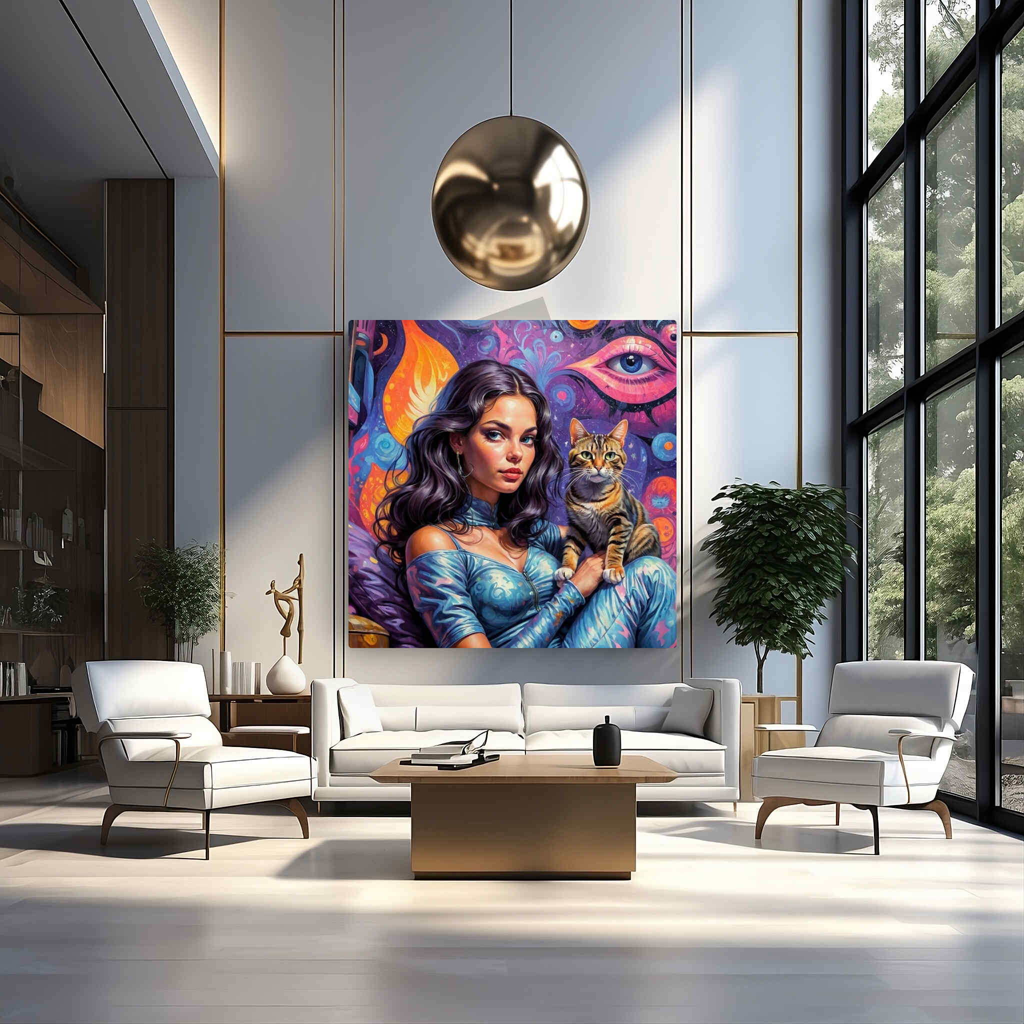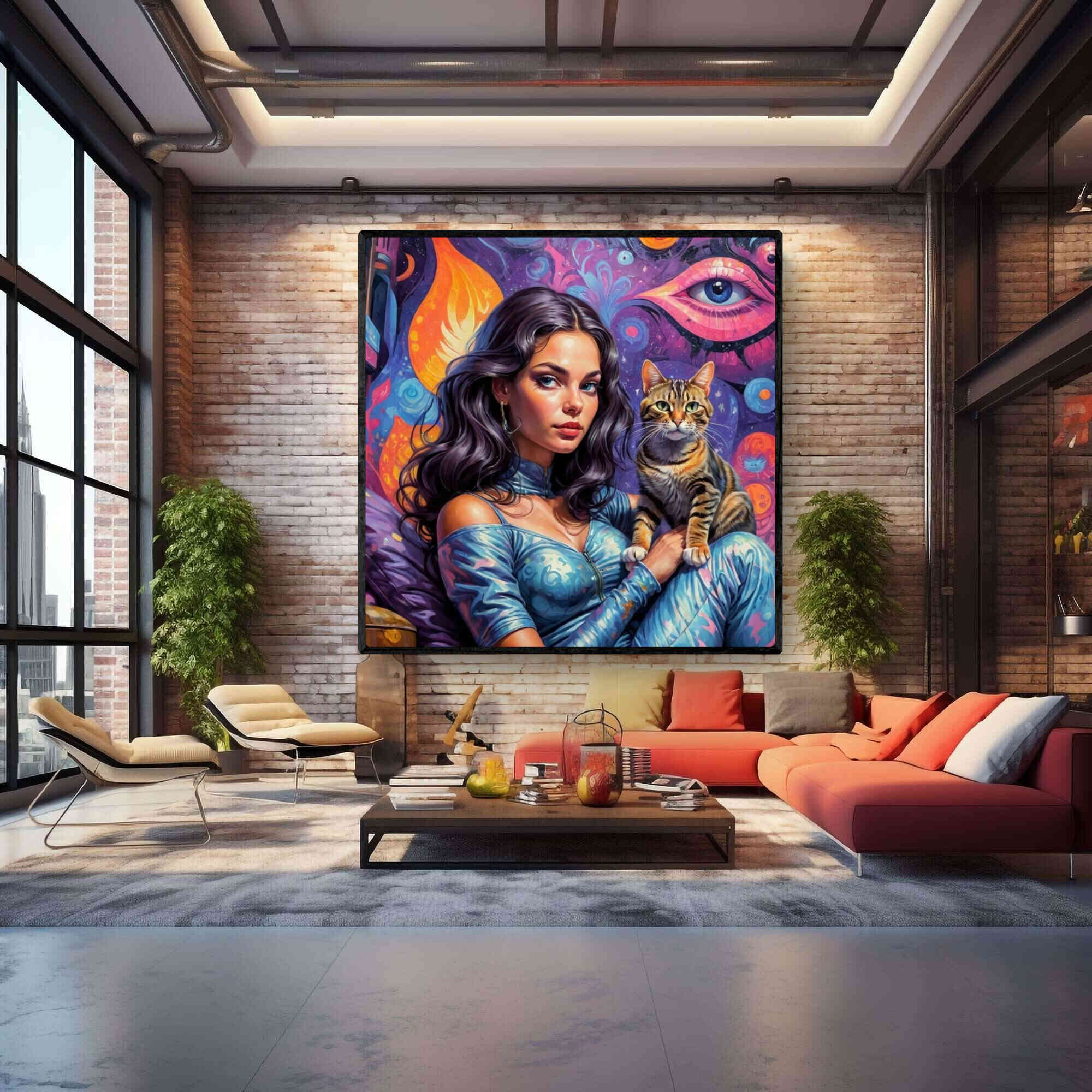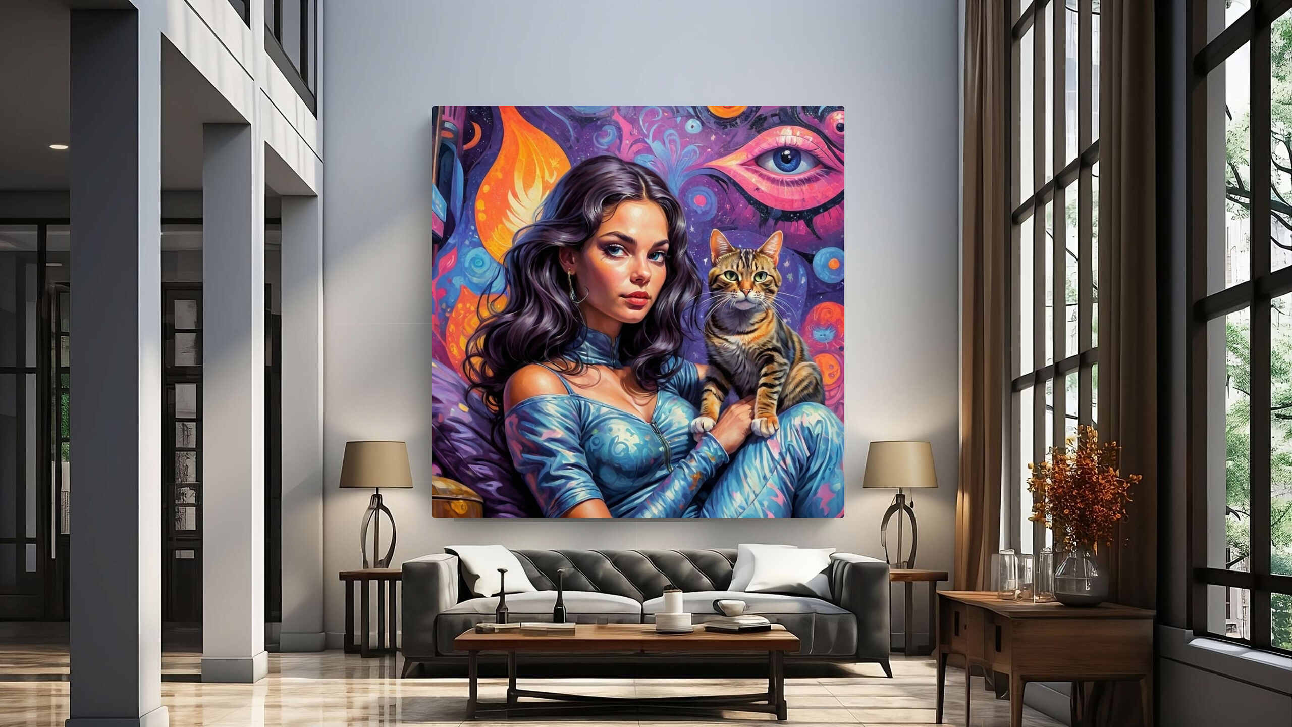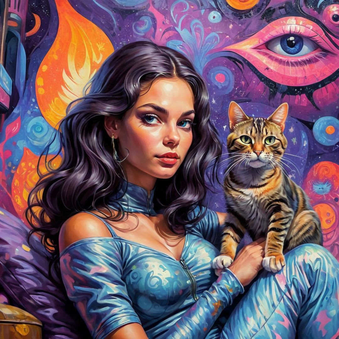 There’s a whisper of rebellion in her smile, like she knows the rules… and chooses to ignore them. Draped in the shimmer of the psychedelic sixties, she’s equal parts enchantress and outlaw — all cat-eye eyeliner, velvet shadows, and dangerous softness. Her feline companion perches beside her, equally composed, equally untamed.