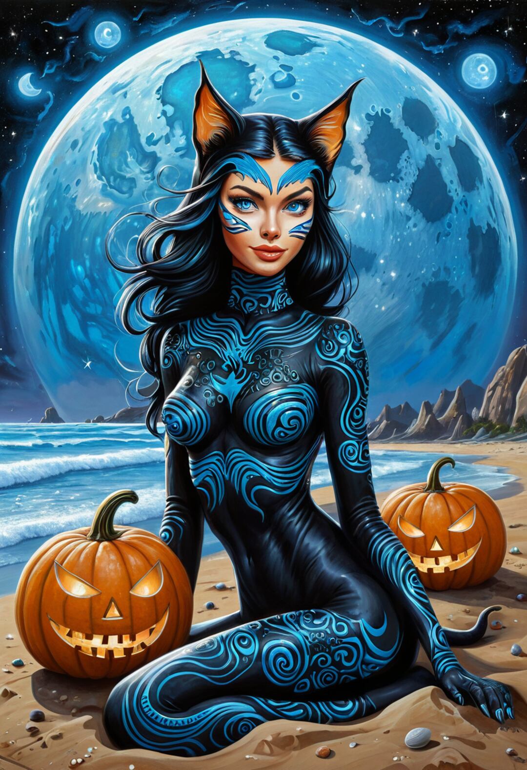 Wrapped in a cascade of raven-dark hair, Nyxara moves through the night as if it were made for her alone. The midnight veil around her shimmers with hidden constellations, each star holding a fragment of forgotten wisdom. Her feline guardian mirrors her poise, its emerald eyes glinting with playful defiance.