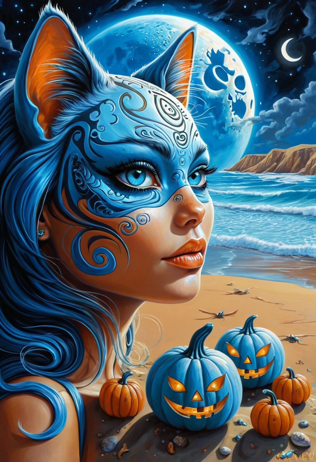 Beneath a vast, midnight sky, Virella stands at the shoreline where the ocean’s breath meets the world of men. Her long hair shimmers with strands of silver, catching the moonlight as her feline companion protects out of sight. With every movement of her eyes, the tide bends closer, carrying with it the blessings of the deep.